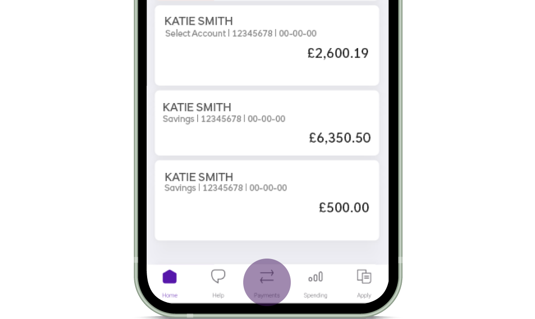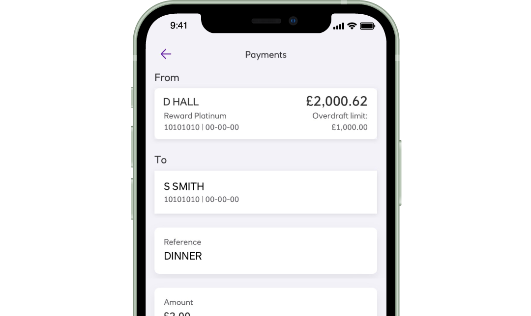 Select ‘Send money’, ‘Make a payment’, then ‘Pay someone new’. Enter the payee’s first and last name, select the account type (Personal or Business), then the account number, sort code and reference details.